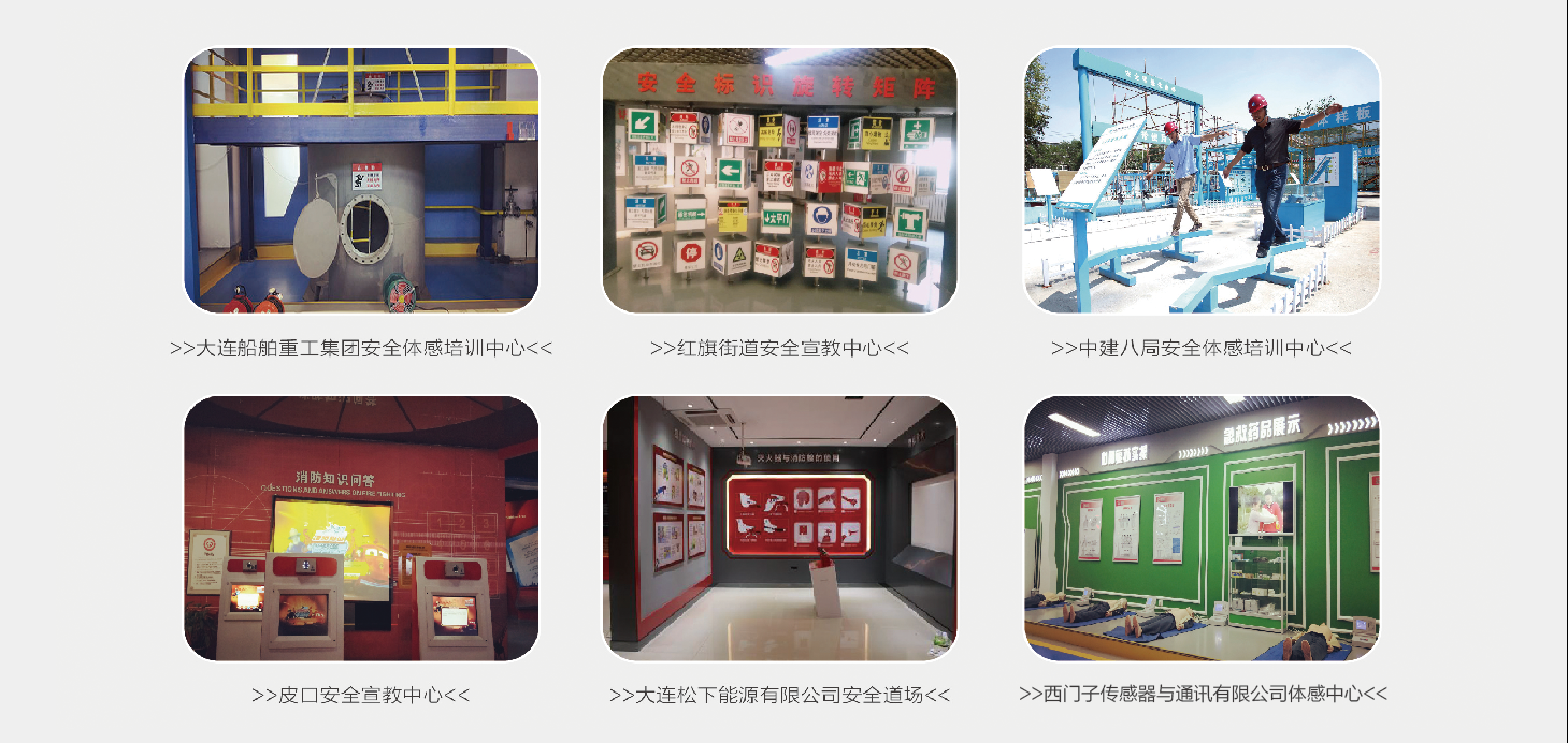 在多年安全技术服务过程中,积累出安全文化建设理论与实践结合的方法,并将展览展示教育体验应用于安全教育培训中,通过视觉、听觉、触觉提升培训效果。从2011年开始参与建设安全体验教育中心,如皮口安全社区教育展示、李家街安全教育展示室、大连松下汽车能源有限公司安全道场、西门子体感中心等成功案例。在安全体感中心设计规划和建设上,摸索出一套切实可行的设计、创建和实施方案。